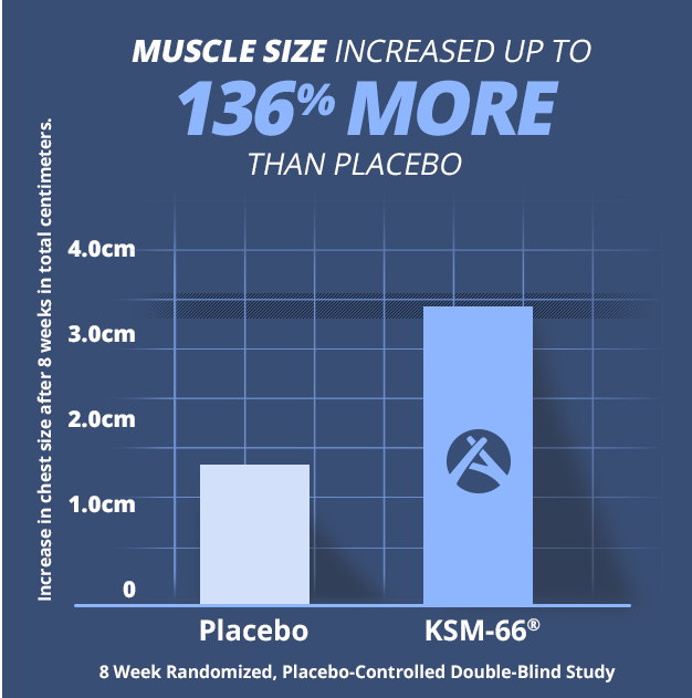 Muscle growth: KSM-66 Ashwagandha supplementation caused improved muscle growth as measured for the thigh, arm and chest (p<0.05). At the end of the study, 8.1%, 17.1% and 3.3% increases in muscle size for thigh, arm and chest respectively were observed with ashwagandha supplementation.