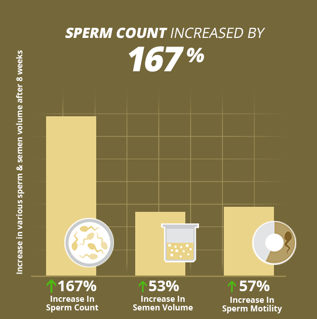 Not all men in their 50s+ really care too much about sperm count, but all the younger fellas that may be struggling please take note that KSM-66 helped test subjects increase sperm count by 167% – almost 2X as much!
