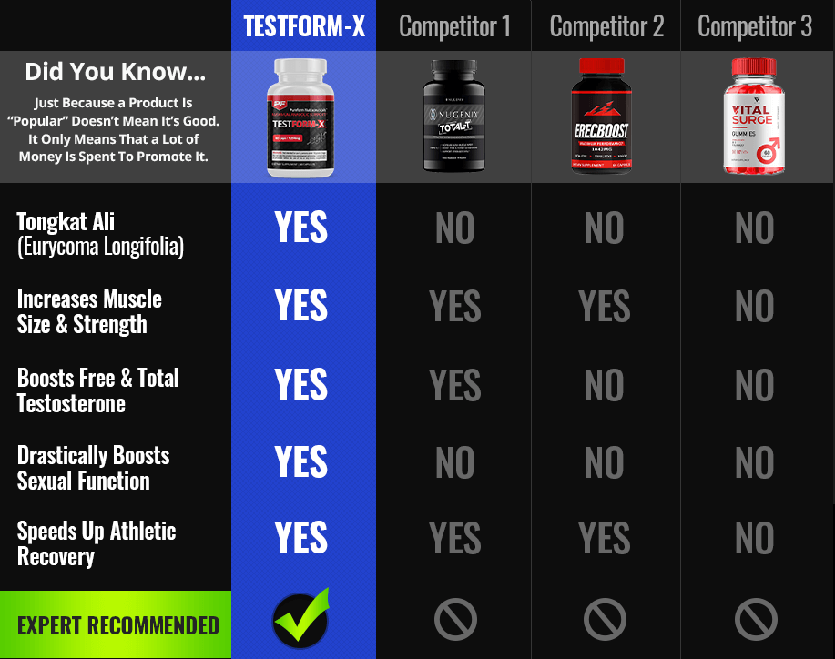 1. Hi BigT, we measure the overall effects of TestForm-X and compare that with what the majority of men are looking for when they want to choose a product. Usually, it’s not as simple as just boosting T levels. The majority of guys want to see more energy at the gym, more strength, higher libido levels, an increase in strength, and likely a boost in overall confidence. TestForm-X will encompass all of these positive effects and that’s why we rank it number 1 compared to what’s out there.